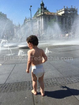 Mia sorella scalpitava per una visita alla Hofbräuhaus e un po’ di shopping all’Hard Rock Cafè e l’abbiamo accontentata molto volentieri! Presa una sacchettata di souvenirs ci siamo incamminati verso le fontane di Karlplatz dove decidiamo di spogliare mio figlio e lasciarlo correre nudo insieme agli altri bambini.